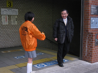生徒会挨拶運動・人権啓発運動 公開日 2014/12/16 更新日 2014/12/16 生徒会 毎月恒例となっている生徒会の挨拶運動が今週のはじめから展開されています。 今回は、通常の挨拶運動に加えて、地生連が主催で募集された人権標語をカイロに貼った物を、街頭で配り、人権啓発に取り組みました。 校門前・地下鉄鞍馬口駅付近・今出川駅付近の三カ所で運動を行いました。道行く人も笑顔でカイロを受け取って下さいました。