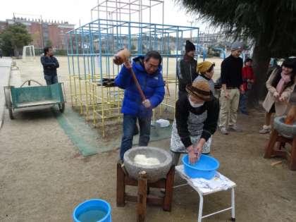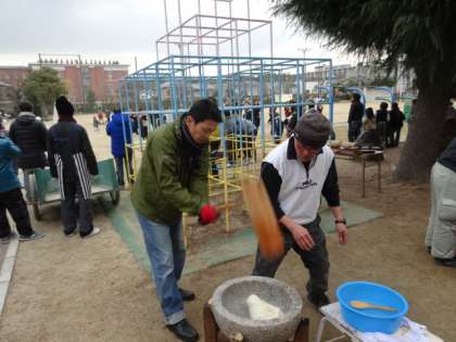 室町小年補導餅つき大会 公開日 2015/01/11 更新日 2015/01/11 PTAより 昨年末に予定されていた室町の恒例の餅つき大会が、選挙で延期となっていましたが、本日好天に恵まれる中、盛大に行われました。 朝早くからPTAの役員さん達もお手伝いに訪れ、ぜんざい作りのお手伝いや、餅を丸めたりする仕事をしていただきました。 学校長もPTA会長も、餅つきにチャレンジ。一臼ついては腕がパンパンになりながらも、ぜんざいもいただいて楽しく過ごすことが出来ました。