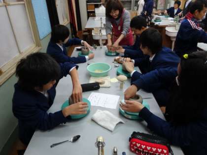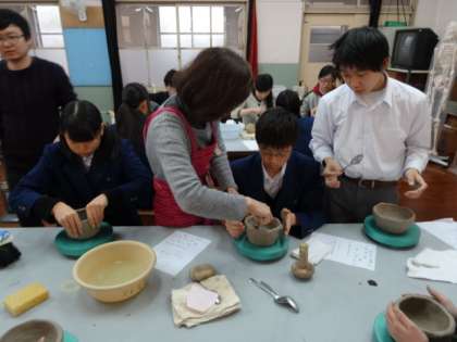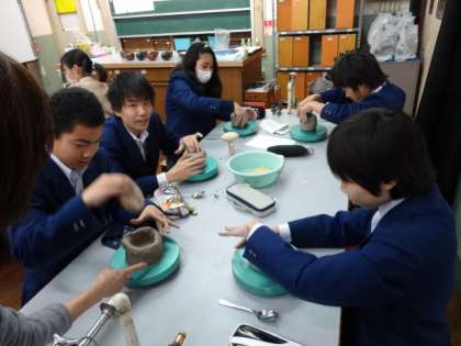 1年陶芸教室行われる 公開日 2015/01/21 更新日 2015/01/21 学校の様子 伝統文化教育のひとつとして、毎年取り組んでいる1年生の陶芸教室が、本日の3,4限を使って行われました。 陶芸教室アトリエYから指導員が4人ほど来て頂き、丁寧に説明された後、ろくろを使って茶器の制作に取り組みました。いびつなものや、ひょろ長いものなど、茶器にしてはちょっと…というものもありましたが、この後、乾燥させて釉薬を塗り、やきあがったものが届くまで、とても楽しみですね。