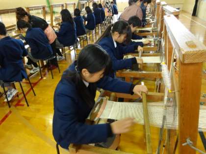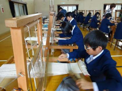 伝統文化教育の取り組みの一環として、教育委員会が推進する京の「匠」ふれあい事業(京の「匠」先生派遣事業)の一つとして、1年生が西陣織の機織り体験を行いました。