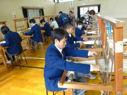 西陣織会館から簡易機織り機を22台お借りし、一人1台の割合で体験することができました。西陣中央小学校出身の人は、すでに小学校でも体験済みで、「あぁそうやそうや」と思い出しながら、慣れた手つきで機を織っていました。実際の機織りは何倍も複雑なもので、伝統工芸の職人の技が必要ですが、こうして、着物や帯が作られていくのだという感覚を味わう事が出来たのではないでしょうか。
