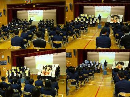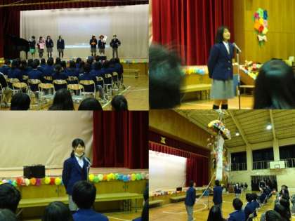 最後は、1年間の思い出ビデオを全員で鑑賞し、生徒会長と3年生の代表の挨拶があり、くす玉を割って会を終えました。