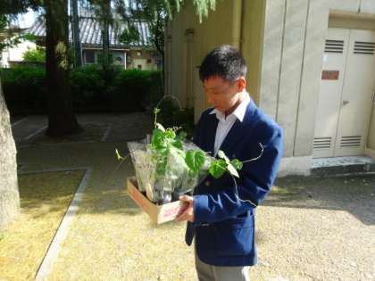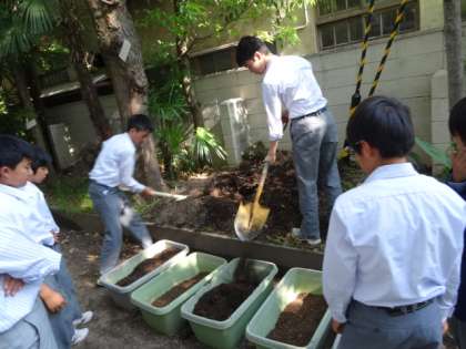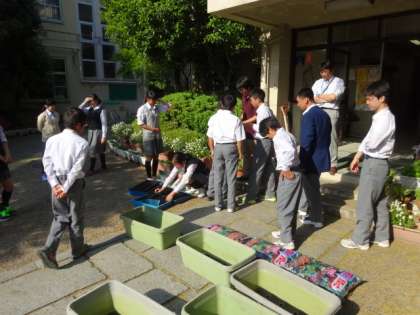 美化委員会活動中 公開日 2015/05/13 更新日 2015/05/13 生徒会 本日、各種専門委員会・生徒議会が開かれ、それぞれの委員会が独自の活動を行いました。 その中で美化委員会は、プランターの土を入れ換え、新しい種を植える作業を行いました。植えた種は観賞用のトウガラシで、カラフルな実が出来るそうです。楽しみですね。 また緑のカーテンの取り組みとして、アサガオを植える作業も行いました。