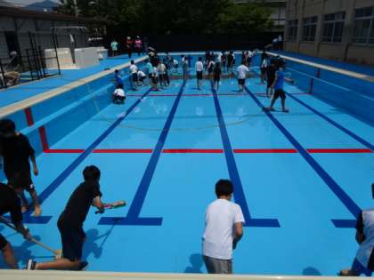 第一回定期テストが終了し、五月晴れの中、来週から始まる体育のプールの授業を控え、プール清掃が行われました。