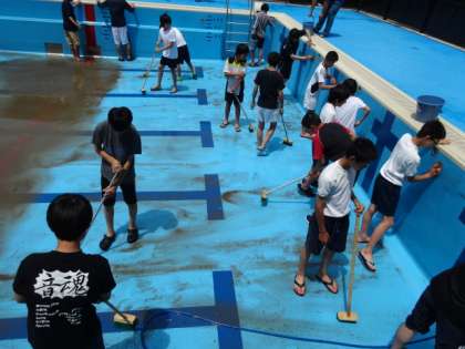 野球部・サッカー部の生徒も参加してくれ、教職員と共に汗を流しました。今年は、昨年度末にプールが新調し、ブルーの美しいプールに生まれ変わったばかりです。ですので汚れも少なく、みるみるうちにきれいになりました。