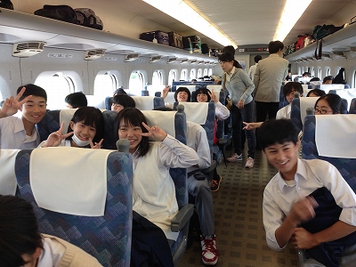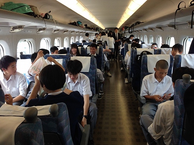 新幹線で東京へ 公開日 2015/05/28 更新日 2015/05/28 3年修学旅行 一行は、無事京都駅に着き、のぞみ310号に乗車、一路東京駅を目指します。 新幹線に乗って一息つくや否や、たちまちゲーム会場となっているようです