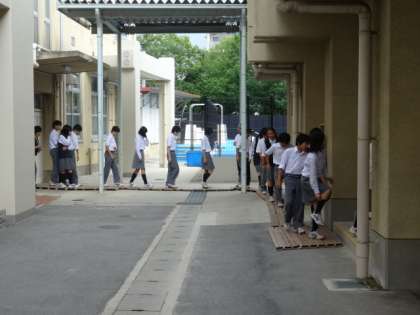 14:23緊急地震放送が流れると、事前の学習通りみんな一斉に机の下に頭をかくし、安全を確保しました。その後、避難の放送指示があり、全員が雨のため臨時で体育館に集合しました。指示から全員集合確認が取れるまでの時間は2分14秒。昨年度の冬の訓練より15秒ほど縮まり、大変速やかな行動ができました。
