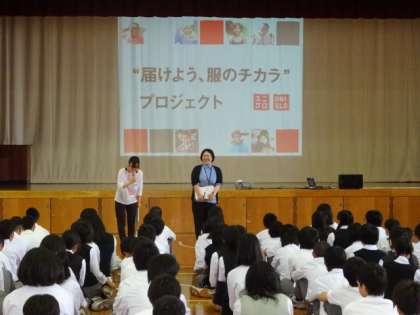 この取り組みは、生徒が主体となって、着なくなった子ども服を回収して、難民の方々など世界中で服を本当に必要としている人々に届ける活動で、この活動を通じて、国際問題や環境問題に関心をもつだけでなく、服のチカラを知り、自分にもできる社会貢献があると気づくきっかけになればとという趣旨で行われます。