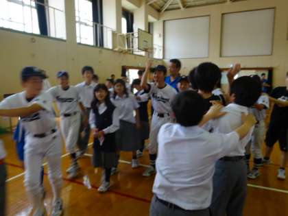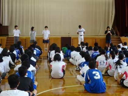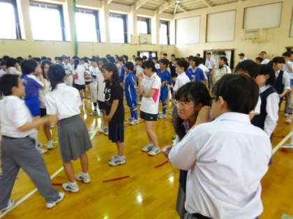 生徒集会 公開日 2015/07/09 更新日 2015/07/09 生徒会 今日の5時間目は生徒集会が行われました。 まずは通常の生徒会活動の報告や、お知らせが各委員長から行われました。 引き続き、恒例となっている、全校レクレーションが行われました。生徒総会でも出され、チーム烏丸が全校で仲良くなれるように、縦割りで全員が混ざったレクレーションを執行部の企画で進めてくれました。人間列車や伝言ゲームなど、1年生から3年生まて゜みんなが交流し、楽しい時間が過ぎていきました。