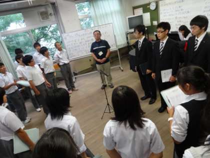 そんな今日、毎年恒例となっている同志社大学の学生さんとのコラボの一つとして、男声合唱サークル、グリーのみなさんが12名も烏丸中学校に来て下さり、それぞれの学年・クラスに入って丁寧に歌の指導をして下さいました。