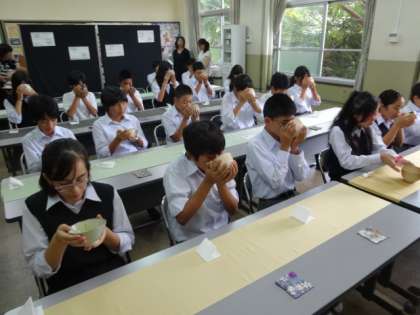 今年は、1,2年生は簡単なお茶のこころとお菓子やお茶を頂くときの作法を聞いた上で、実際に食べたり飲んだりしました。中には苦いっという顔をしている人もいましたが、中にはニコニコとうれしそうな人もいました。