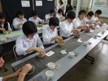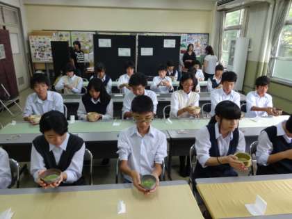 3年生はおもてなし集会に向けて、今度は自分たちでおもてなしをするという前提の元、抹茶も自分で点てるところから行いました。3年生は今年で3回目なのでさすが慣れた物で、手際よく点てて、お菓子とお茶を楽しむことが出来ました。
