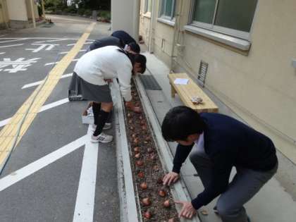 美化委員会活動中! 公開日 2015/10/29 更新日 2015/10/29 生徒会 後期の生徒会各委員が決定し、今日生徒議会。専門委員会が開かれました。 美化委員会は、地域ふれあい事業と、PTA環境美化事業の支援を受けて、この前地域ふれあい事業で整備した花壇に、チューリップの球根を植える作業を行いました。芽が出て、4月には、赤・白・きいろ…おなじみのチューリップの花が満開に咲き誇ることでしょう。 またおもてなし集会も近づいてきているので、可愛いお花を整備する作業も行いました。