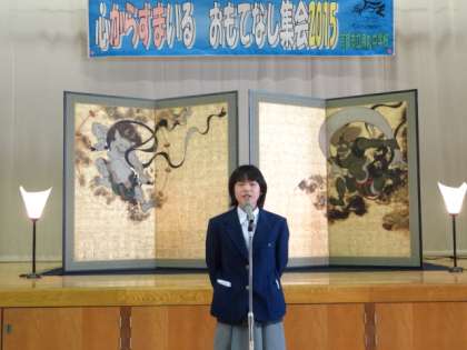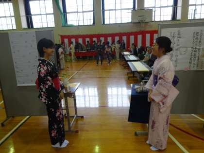 1年生は地域からすまいる、2年生は和菓子からすまいる、3年生はおもてなしからすまいる、で来校者をおもてなしします。
