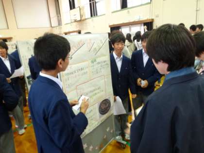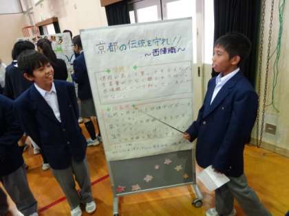 心からすまいるおもてなし集会1年 公開日 2015/11/07 更新日 2015/11/07 伝統文化 1年生は、これまで地域に出かけていったり、書物やネットなどで調べた地域のことをポスターセッションの形で発表し、来校されたみなさんとのやりとりを楽しみながら、おもてなしを行いました。
