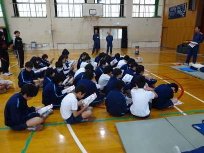 今日の3,4時間目、保健体育の時間を拡張して2年生全員を対象とした、AEDによる救急救命の講習会が行われました。
