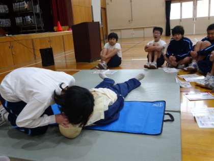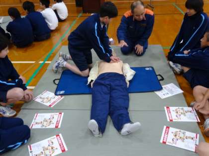 上京消防署から3人の署員の方にご来校頂き、AEDが無かったために二度と灯らない命の炎があったこと、そしてAEDによって救える命があることを学び、AEDの使用方法と、心肺蘇生法について、全員が人形を使っての実習を行いました。