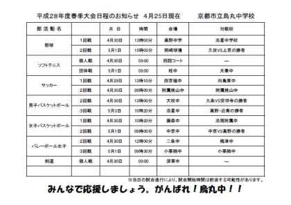4月29日(金)西京極陸上競技場での開会式をかわきりに,春期総合体育大会が始まります。保護者の皆様の熱い応援をお待ちしております。