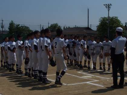 4月30日(土)高野中学校グランドで,野球部の春体1回戦が行われました。対戦相手は洛星中学校でした。開始から烏丸中の野口投手の変化球とチェンジアップに洛星打線はタイミングが合わず,真っ芯でミートされることはまずありませんでした。そして2回表に相手のパスボールで烏丸中が1点先取。しかし3回裏に洛星中のヒットで1点,更に4回裏にはスクイズで1点を取られ,1−2で惜敗しました。烏丸中の守備はほとんどミスもなく非常に安定した試合ぶりでした。夏の大会に向けて期待をつなぐことの出来る内容の好ゲームだったと思います。