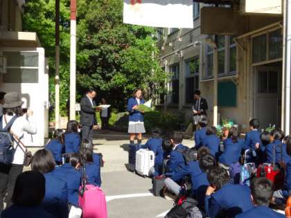 「仲間・絆・体験を大切にしましょう」という修学旅行実行委員長の山本さんのあいさつ