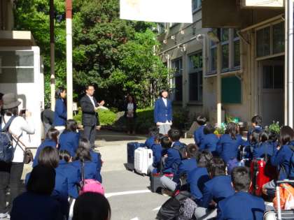 待ちに待った修学旅行です。天候は快晴,遅刻者0 欠席者0で結団式を行いました。
