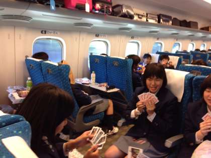 修学旅行1日目 その3 公開日 2016/05/12 更新日 2016/05/12 3年修学旅行 予定通り9:26発のぞみ218号に乗車して旅路につきました。オヤツも解禁になり、どの座席でもトランプと写真の撮りあいで盛り上がってます。