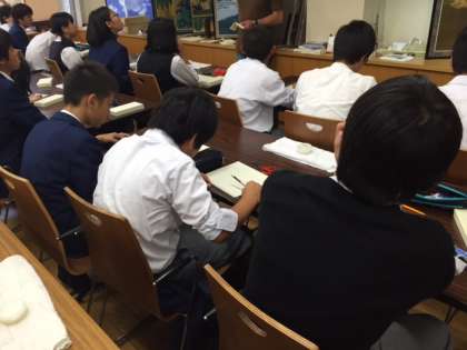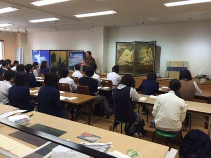 修学旅行3日目 その3 からくり屏風グループ 公開日 2016/05/14 更新日 2016/05/14 3年修学旅行 からくり屏風体験のグループです。開いたり閉じたりする度に絵が変わる屏風に興味津々で,みんな制作に集中しています。