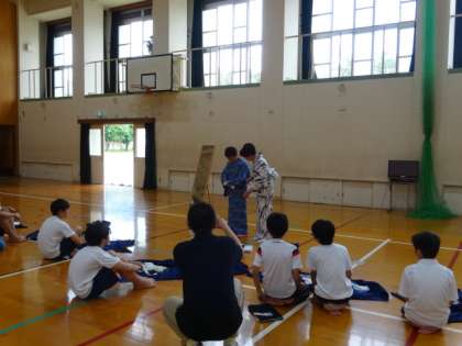 1年生対象の和装教室 その1 公開日 2016/06/21 更新日 2016/06/21 伝統文化 本日は1年生を対象に和装教室が行われました。「浴衣の着方や着た後のたたみ方を教わり、実際にやってみよう!」という目標で,和装教育国民推進会議京都支部より4人の講師の先生に来ていただき,実際に浴衣を着てみました。