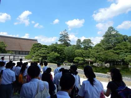 1年生 「京都御所」見学 公開日 2016/07/07 更新日 2016/07/07 伝統文化 7月6日(水)猛暑の中,1年生が「京都御所」の見学に行きました。普段なかなか見れない皇居の「清涼殿」や「紫宸殿」さらに「蹴鞠の庭」を見ることができました。平安京にタイムスリップしたようです。