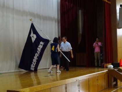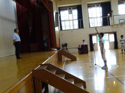 夏季選手権大会 激励会 公開日 2016/07/07 更新日 2016/07/07 学校の様子 本日6限,生徒会集会の後,夏季選手権大会激励会が行われました。各運動部のキャプテンから日程や抱負が語られ,野球部キャプテンの選手宣誓,女子バスケット部キャプテンの生徒会旗の受渡も堂々とした態度で行われました。