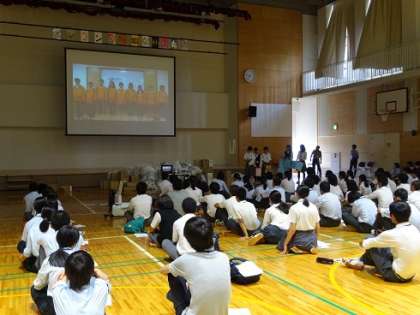 全体会1では、学校紹介やアイスブレーキングを行いました。そして、今年度のスローガン「人と人とのつながり〜目の前の1人から世界の人々へ〜」のもと、共通取組で行ったエコキャップとプルタブ回収を持ち寄りました。
