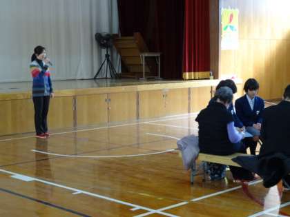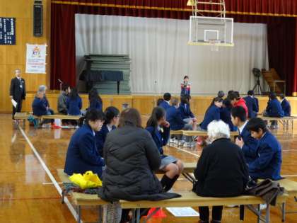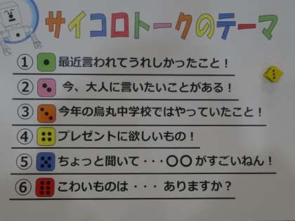 大人の方と生徒(1年生)がテーマに沿って話をする「ふれあいトーク」が行われました。人づくり21世紀委員会の大人の方を相手に,終始和やかな雰囲気でトークを楽しんでいました。テーマはサイコロを振って決めます。