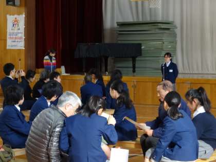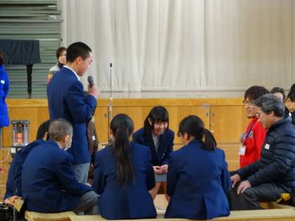 烏丸ふれあいトーク その3 公開日 2017/01/26 更新日 2017/01/26 学校の様子 先生の話になったグループもあったようですが・・・ 年齢差はあるけれど,色々な話ができて,とても刺激的な2時間でした。最後は各班から一人ずつ班の様子を発表してもらいました。どの代表生徒もしっかりと発表できました。最後は柳橋さんの挨拶で締めくくり,終了しました。 自分の思いを,自分の言葉で,直接相手に伝える事の大切さや,おもしろさをわかってくれましたか?