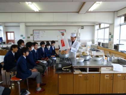3年生を対象に京料理「畑かく」さんより講師をお招きして「だし」の授業をしていただきました。平安京の頃,山里より猪,鹿。近江より琵琶湖の魚が都に運ばれていましたが,農作物は地元でとれました。この農作物をおいしく食べるために昆布と鰹で「だし」をとり,煮炊物や吸物に使われたそうです。京都の水はミネラル分が少なく,昆布のうまみが出やすいそうです。