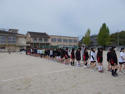 行進練習 公開日 2017/04/27 更新日 2017/04/27 学校の様子 4月27日(木) 今月29日(祝)に西京極運動公園陸上競技場で行われる京都市中学校春季総合体育大会開会式に向けて、行進練習を行いました。終学活後、グランドに集合し各部活動(体育系)の開会式参加者が元気に行進しました。