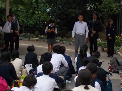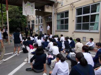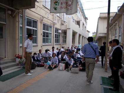 5月12日(金) 17:00前 烏丸中学校に到着。3年生全員無事に戻ってきました。中庭にて解団式、司会はHさん。疲れているにもかかわらずしっかり司会をしてくれました。また、修学旅行副委員長のOくん、がんばって挨拶してくれました。本当にご苦労さまでした。3年生の皆さんおつかれさまでした。来週からの学校生活は気持ちを切り替えて、がんばってやりましょう。テストも近いですよ、しっかり学習してくださいね。今日はゆっくり休んで、たくさんの思い出とともにいい夢を見て下さい。