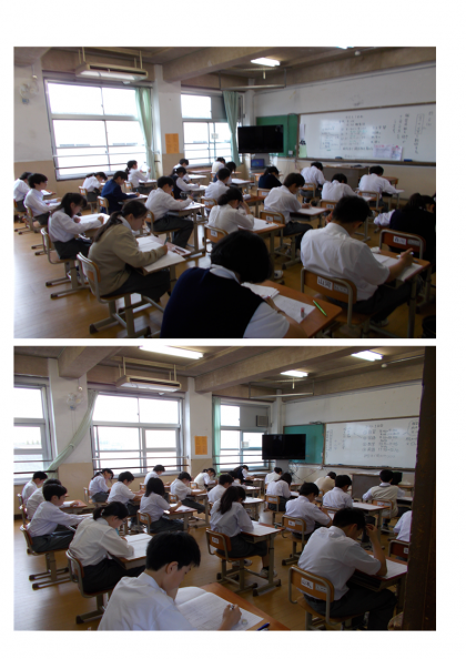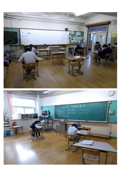 5月25日(木) 第1回定期テスト1日目です。1年生にとっては初めての定期テストとなりました。少し緊張気味の様子ですが、最後まであきらめずがんばって下さい。1,2組は国語テスト・数学テスト・英語テスト 3,4組は数学テスト・社会テスト・道徳です。