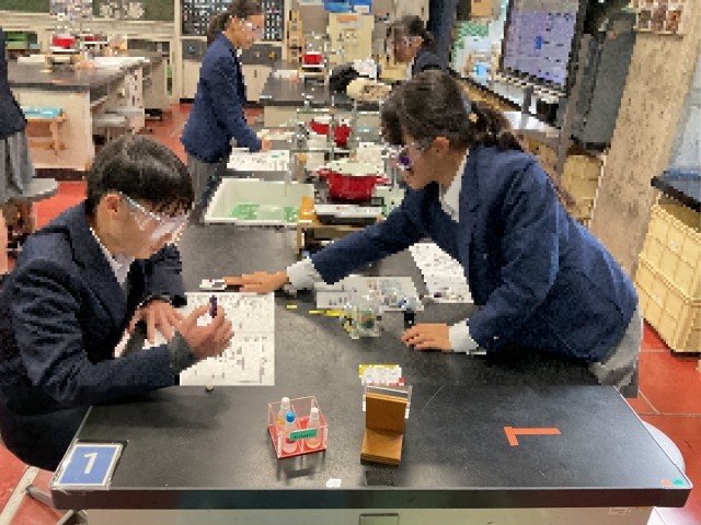実験室での実験とプラネタリウム学習を行いました。まず、実験室では4つのグループに分かれて、化学の実験では意外と知らない「色」について、生物の実験では私たちが普段食べている「米」について、地学の実験では身近な空に浮かぶ「雲」について、物理の実験ではあらゆるところに存在する「しん動」について学習を深めました。次に行われたプラネタリウム学習では、季節に見られる星座や惑星、星雲・星団について学習しました。とても興味深い内容で、1年生のみなさんは楽しく、そして頑張って学習することができました。
