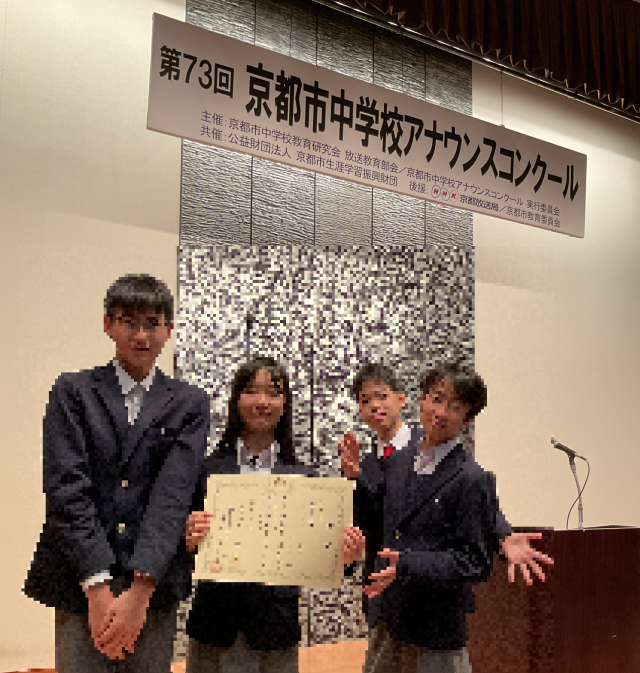 2月1日、放送部は第73回京都市中学校アナウンスコンクールに出場しました。課題原稿をアナウンスする「アナウンス部門B」に1名、課題図書『成瀬は天下を取りにいく』を朗読する「朗読部門B」に2名の生徒が出場しました。緊張する中での発表でしたが、練習の成果を発揮し、立派に発表してくれました。その中で、朗読部門に出場した1名が審査員特別賞を受賞、そして団体部門では6位入賞という成績を収めることができました。放送部のみなさん、がんばりましたね。そして、おめでとうございます。