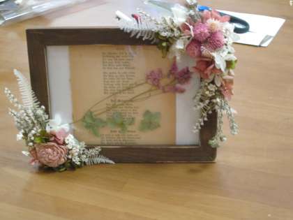 今回はフォトフレームを花で飾るフラワーレッスンの企画です。講師の先生のお話しを聞きながらブリザーブドドライフラワーを使った自分だけのオリジナルフォトフレームを楽しく作りました。出来上がった作品は文化祭で展示されます。