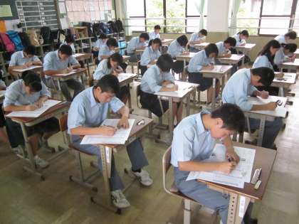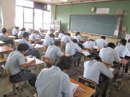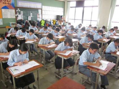 定期テスト2日目のテスト、1年生・2年生は英語、3年生は社会で始まりました。英語はリスニングに取りくんでいます。