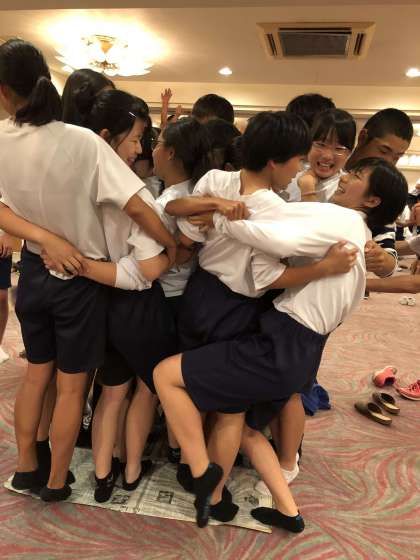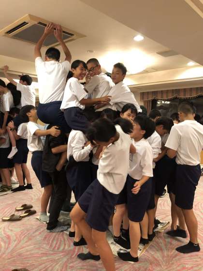 最後はクラス対抗「新聞紙に何人乗れるかな!?」