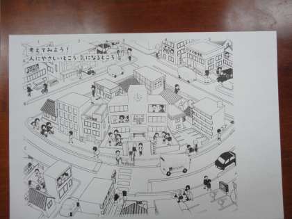 「人権イラストマップ」を使って。「人にやさしいところ」「気になるところ」を一人ひとり見つけ出し,班で話し合いました。