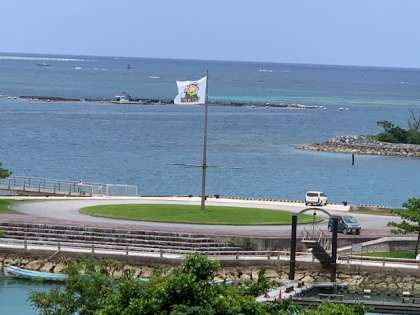 別れを惜しむ上空には,この後のマリン体験場所である「もとぶ元気村」の旗がたなびいていました。