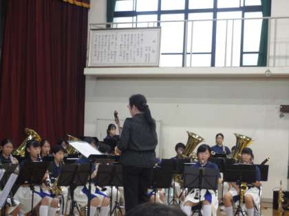 新町小学校の音楽部と本校吹奏楽部が演奏を行いました。