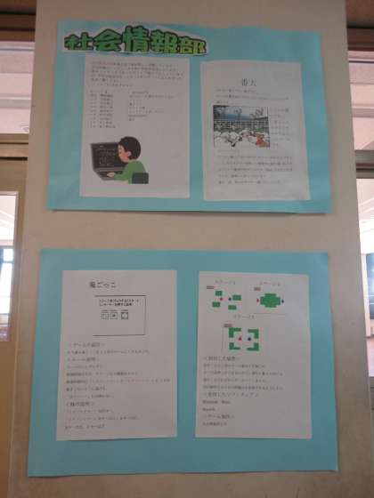 本来なら展示鑑賞の時間に部員が作成したゲームを実体験ができるのですが,今年はその時間がないため,ゲームの内容を掲示物にして発表してくれました。