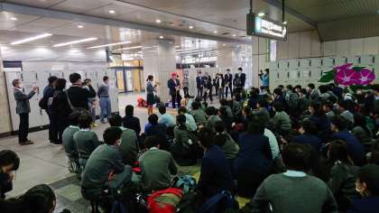 結団式では,校長先生のお話の後,修学旅行委員代表者からのあいさつ,お世話になる添乗員。カメラマンの方々の紹介,そして学年主任の先生から諸注意を受けて,新幹線のホームへ移動しました。