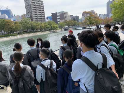 平和記念公園にて,クラスごとに当時の様子の説明をガイドさんから聞いています。