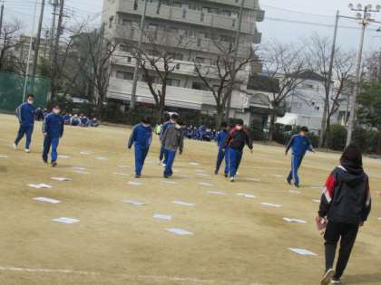 3年生がそれぞれ考えた中学校時代の思い出を5・7・5の句で表したものをラミネートして大きなカルタを作り,それをグラウンドに散らばらせて取るクラス対抗のゲームです。