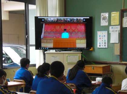 その後,教室では事前に録画した,各クラス・学級旗の紹介・説明を映像で視聴しました。自分のクラスを象徴する旗にはいろんな意味がこもっていて,各クラス,まさにクラスを象徴する「団結の証」となる旗に丁寧に仕上がっていました。
